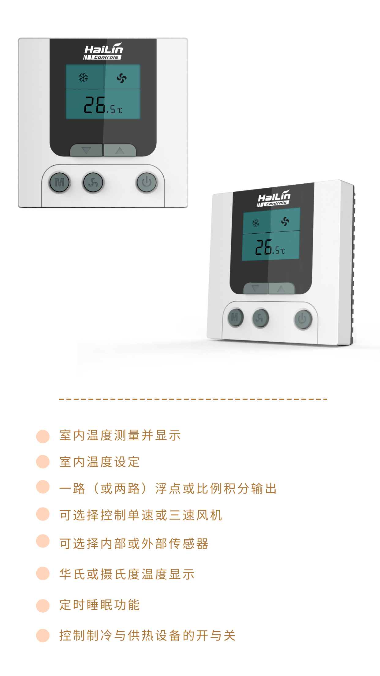 HL7031DB2-L溫控器采用微電腦控制技術,大屏幕液晶顯示,液晶顯示狀態有:制冷、制熱、通風、溫控器輸出、室內溫度、設置溫度等。按鍵有:啟停鍵、功能設置鍵、風速鍵及溫度調整鍵。