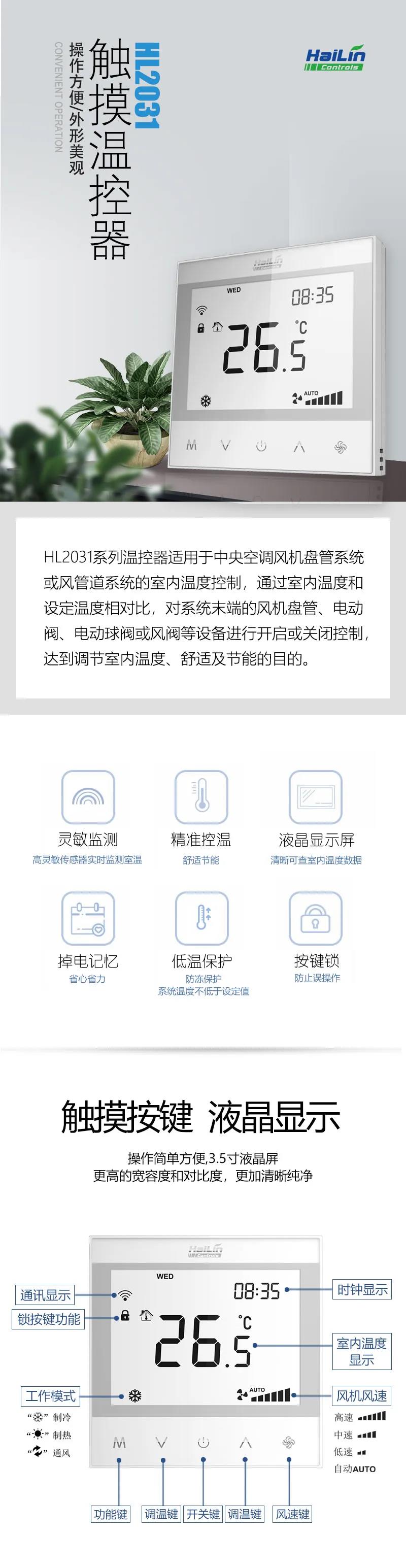海林HL2031溫控器凝聚了海林節能21年匠心工藝,專為每一個認真對待生活的用戶傾情打造,是簡單實效的室內環境舒適體驗誠意之作!