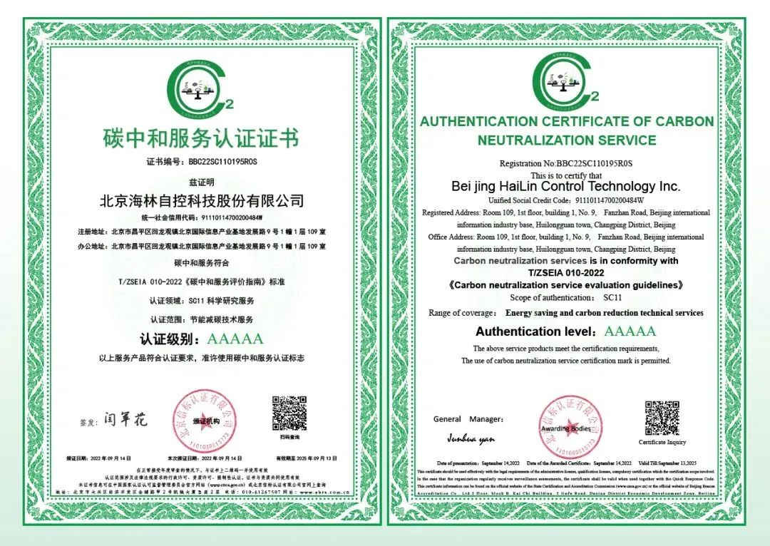 經(jīng)過我司不斷完善、不懈努力,已成功領(lǐng)取“碳中和用戶服務(wù)AAAAA級認證證書”,碳中和服務(wù)認證分為五個等級,即A、AA、AAA、AAAA、AAAAA級,等級越高說明企業(yè)綜合實力和服務(wù)水平越高。此次評審,海林自控榮獲最高級別碳中和服務(wù)認證。