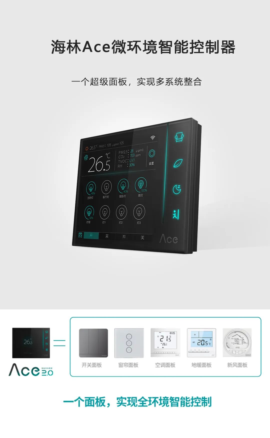 Ace將空調(diào)控制、采暖控制、新風(fēng)控制、燈光控制、窗簾控制、溫度監(jiān)測(cè)、空氣質(zhì)量監(jiān)測(cè)、能耗監(jiān)測(cè)等功能集于一身,一個(gè)面板融合房間所有開關(guān),控制模塊分布安裝,控制面板弱點(diǎn)連接,極大地減少了布線及人工成本。