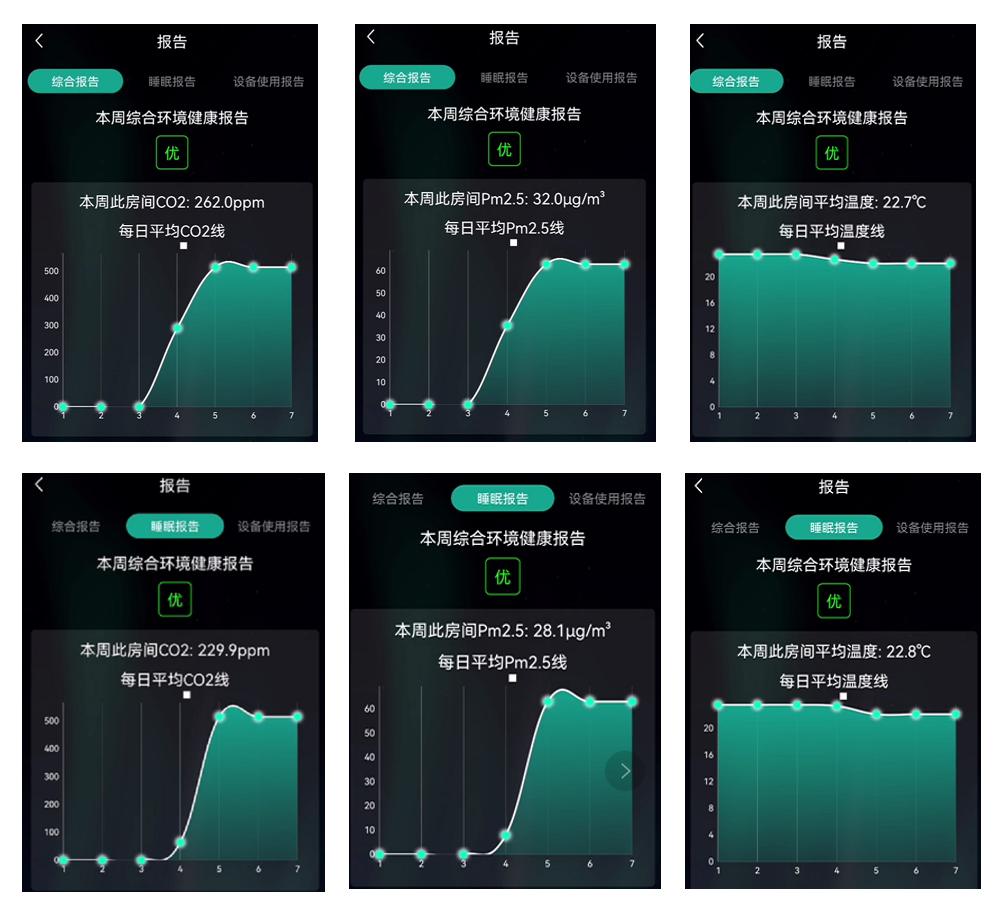 環(huán)境報(bào)告中會(huì)包含“綜合報(bào)告”、“睡眠報(bào)告”和“設(shè)備使用報(bào)告”,綜合報(bào)告和睡眠報(bào)告會(huì)對(duì)客戶的PM2.5、CO?和溫度進(jìn)行評(píng)級(jí),睡眠指的的睡眠期間而綜合是整體環(huán)境。