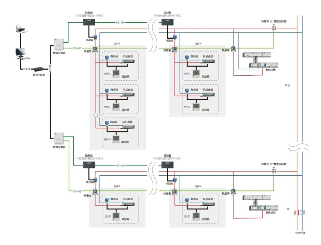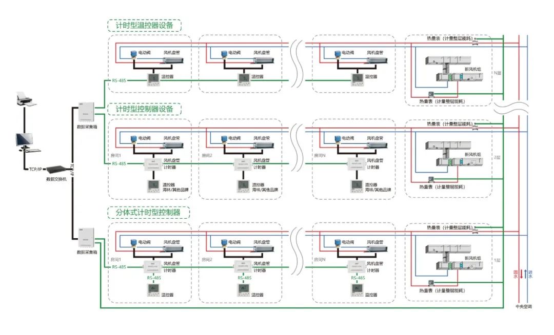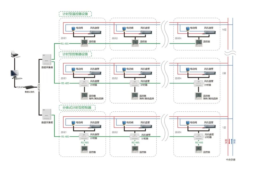 海林HNTS末端溫控器集控系統(tǒng)集自動(dòng)化控制技術(shù)、計(jì)算機(jī)網(wǎng)絡(luò)技術(shù)于一體,可同時(shí)集中或獨(dú)立對多臺末端設(shè)備的啟停、水閥的開閉及溫度設(shè)置進(jìn)行控制。有三種聯(lián)網(wǎng)集控方式:RS-485 有線方式、 LoRa 無線方式和 Wi-Fi 無線方式。