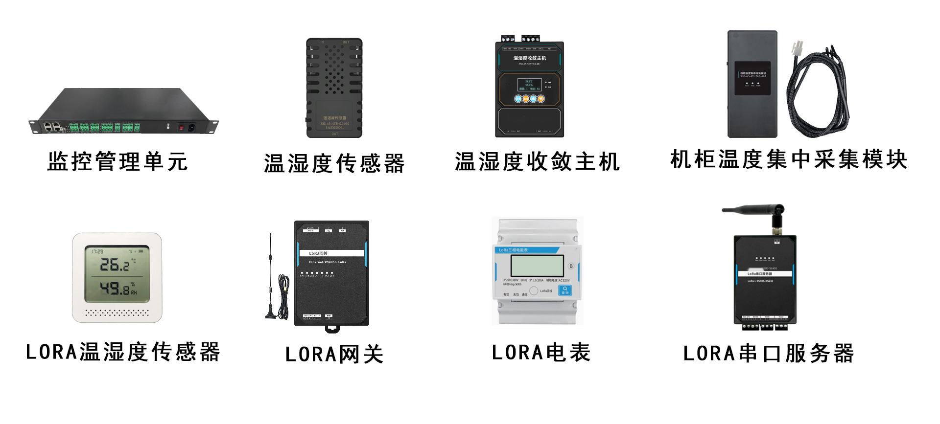 該系統設備由:監控管理單元、溫濕度傳感器/收斂主機、機柜溫度集中采集模塊、LORA傳感器/網關/電表/串口服務器組成