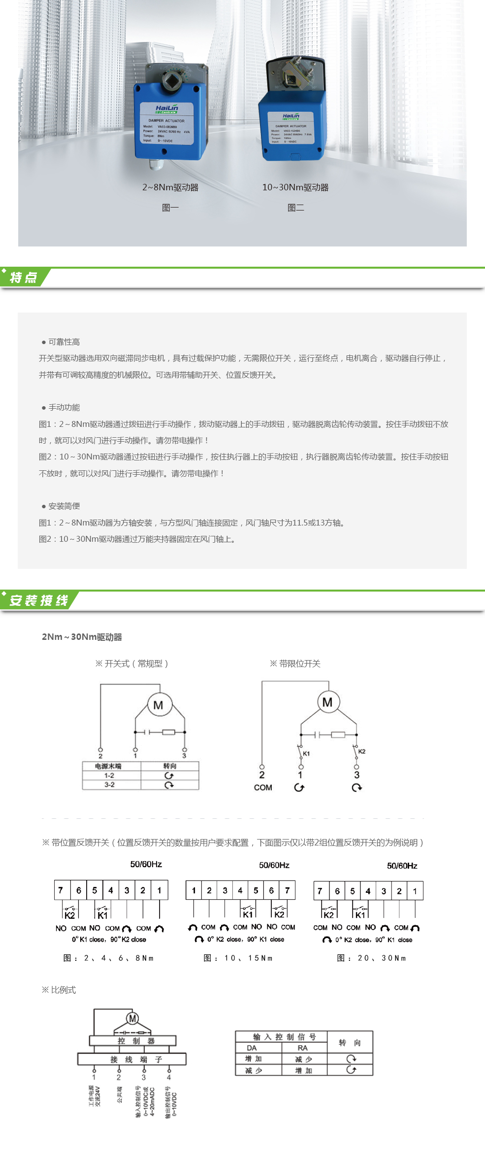 VA03系列風門驅動器采用雙向控制,可提供2~30Nm扭矩,直接安裝于風門、通風百葉窗等裝置上,實現開關、比例式0~10VDC或4~20mA信號控制,并提供0~10VDC的位置反饋信號。廣泛應用于采暖、通風、空調等樓宇自控系統。