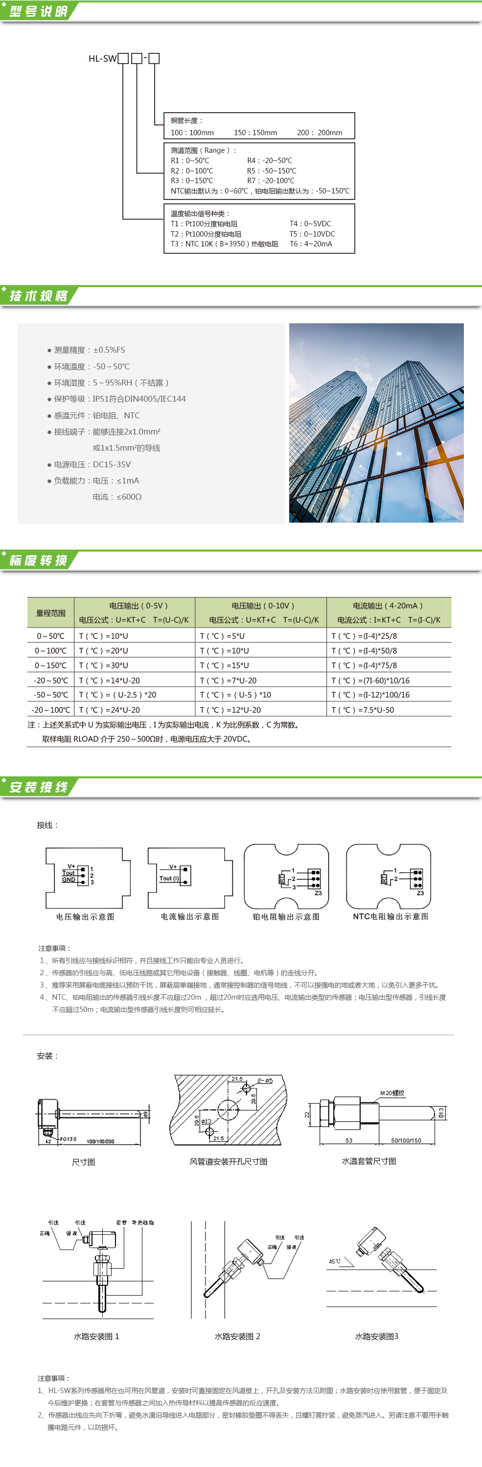 HL-SW系列溫度傳感器廣泛應用于樓宇自動領域,主要用于水管道、風管道的溫度測量,可提供多種溫度測量范圍,以適應管道流體介質的不同;可提供NTC、鉑電阻、電壓、電流信號輸出,可以適應各種控制系統的不同要求。