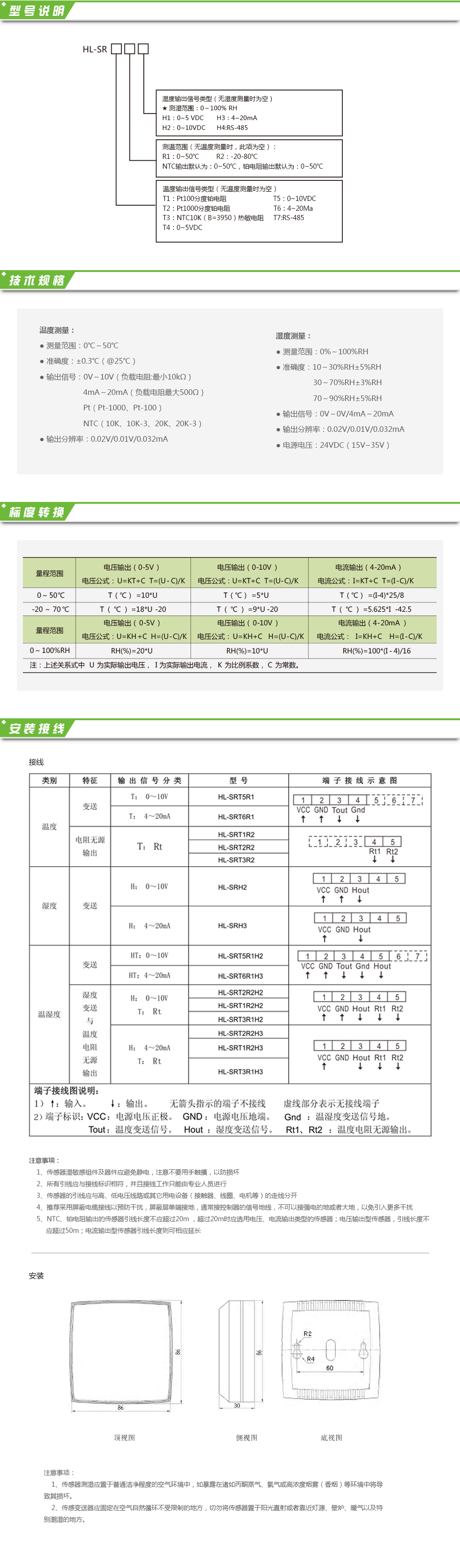 HL-SR系列傳感器廣泛應用于樓宇自控領域,主要用于室內溫度、濕度測量;溫度輸出可提供 NTC、鉑電阻、電壓、電流等信號類型,濕度輸出可提供電壓、電流等信號類型,可以適應各種控制系統的不同要求。