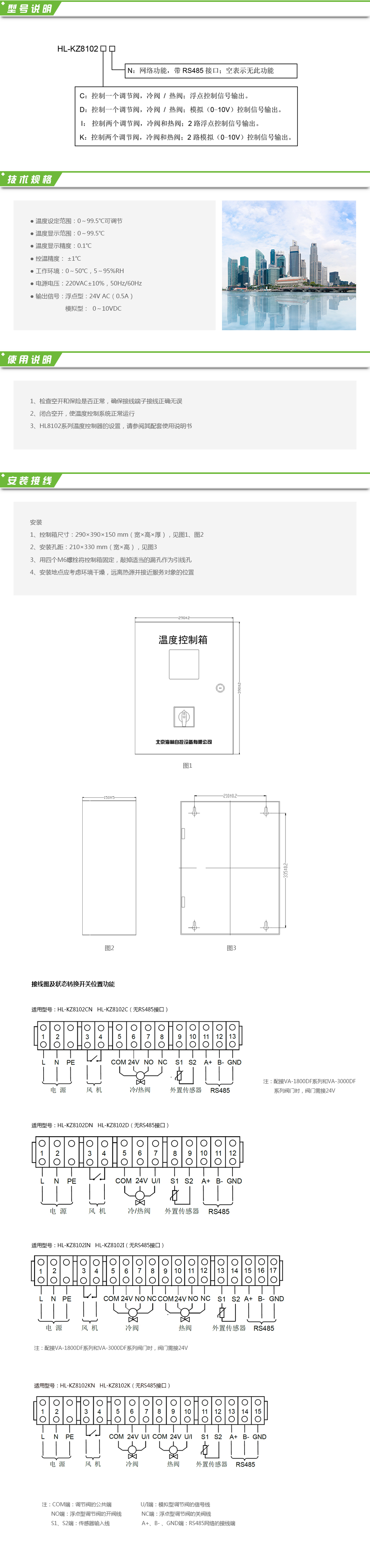 HL-KZ8102系列溫度控制箱配裝HL8102系列溫度控制器,主要應用于水系統或風系統的溫度控制。通過對檢測參數與溫度控制器上用戶設定的參數相比較、判斷,控制電動調節閥的開度,根據溫差控制風機的工作狀態(起動與停止),從而達到恒定水溫或室溫的目的。